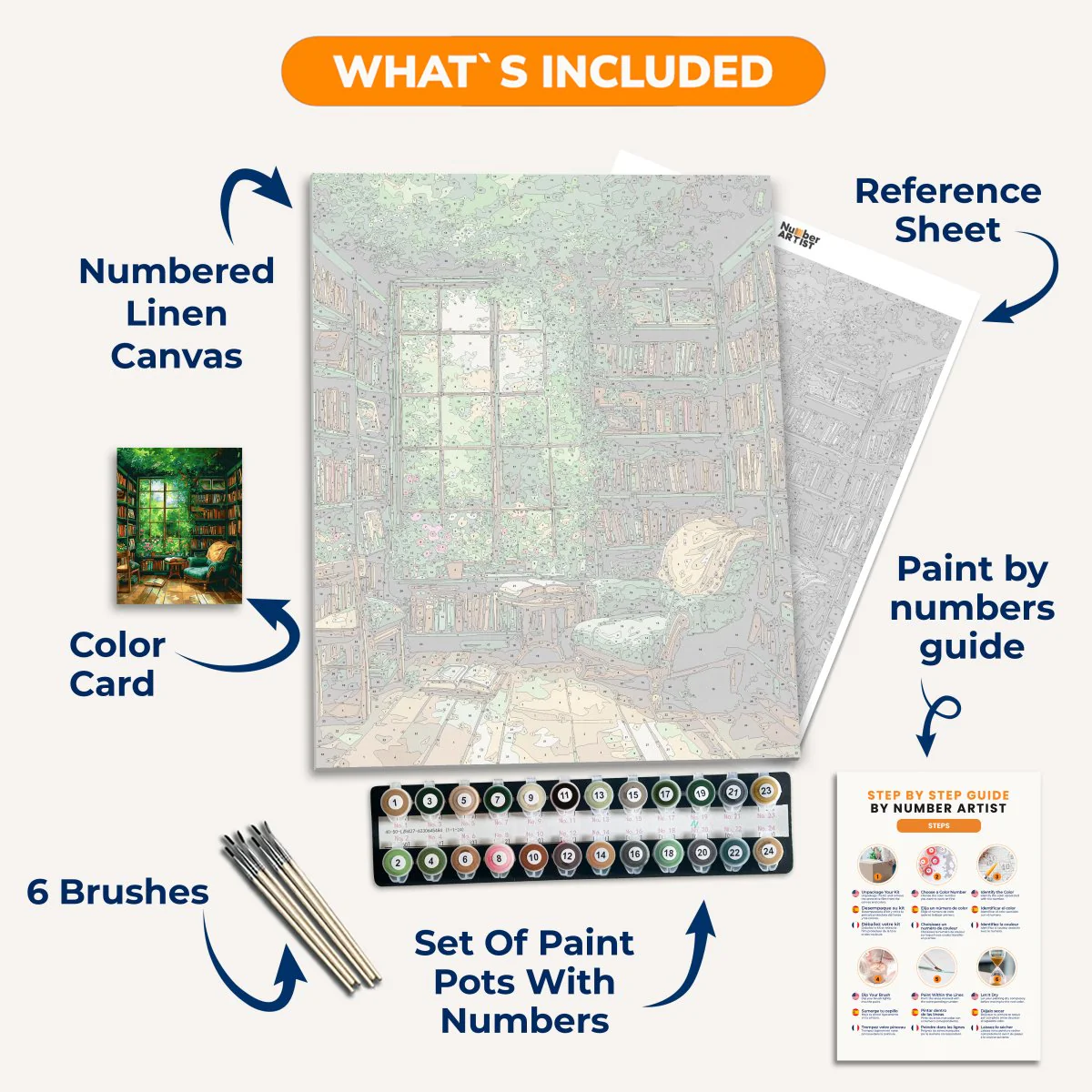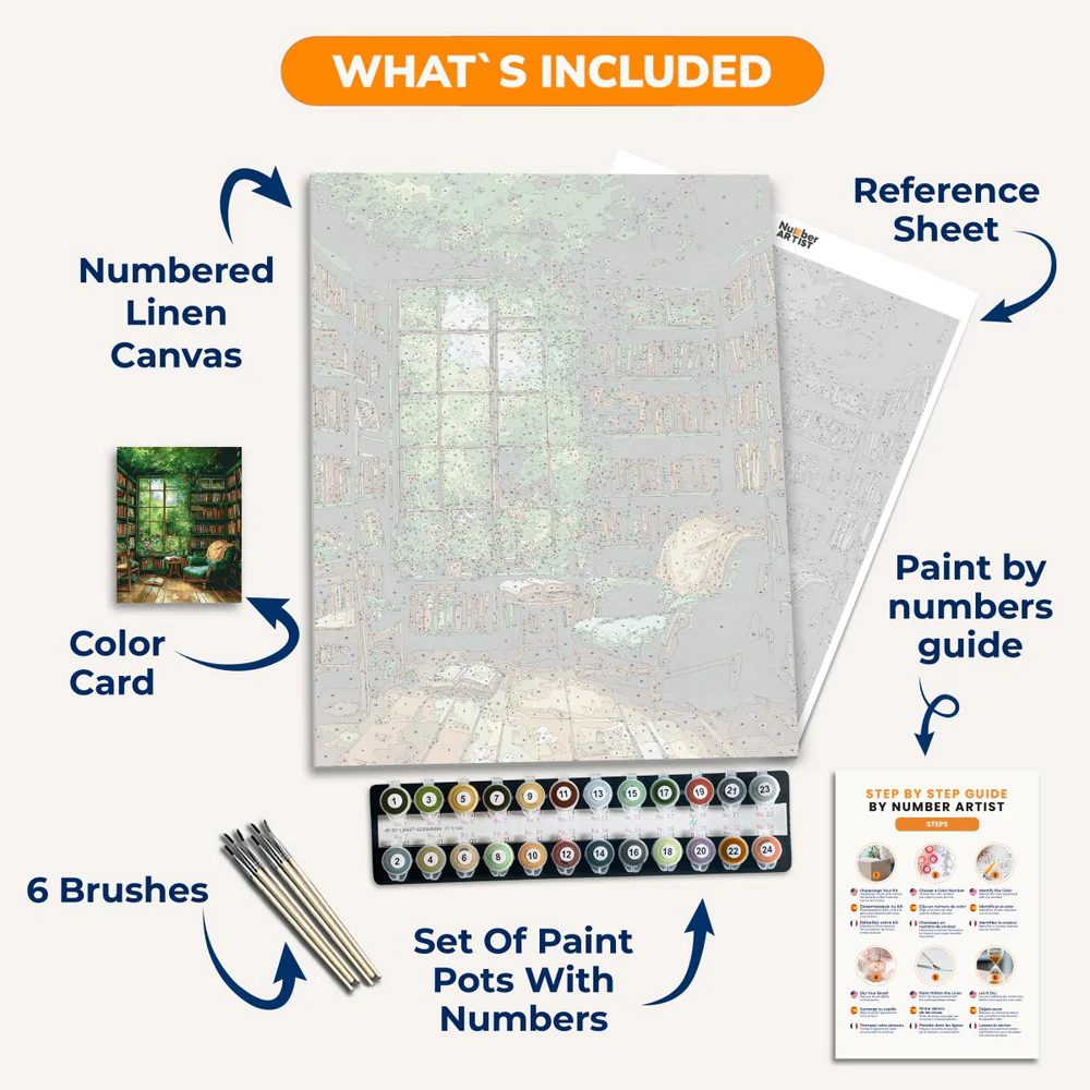 Everything you need for your perfect painting: 1. Numbered linen canvas (16" x 20" | 40x50cm) 2. Numbered paint cases 3. Set of 6 brushes Color card 4. Reference sheet Paint by numbers guide